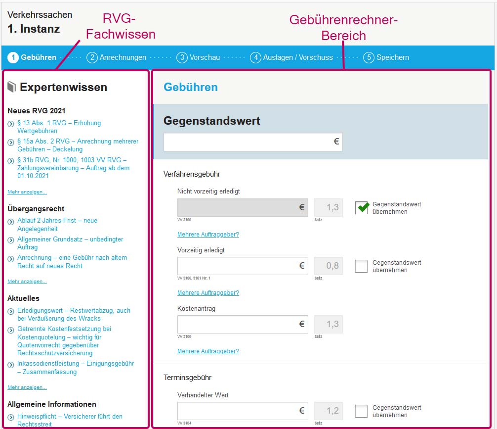 AGO schafft, woran andere Honorarrechner scheitern: Sie können mit wenigen Klicks und Eingaben Honorare korrekt abrechnen – und erhalten zusätzlich für Ihre Abrechnung individuell zusammengestellte Tipps und Hilfestellungen führender RVG-Experten. Beispielsweise vom „Gebührenpapst“ RA Norbert Schneider oder von RVG-Dozent und Dipl.-Rechtspfleger Thomas Schmidt. Dadurch gestaltet sich Ihre Abrechnung effizienter, schneller – und profitabler. Der smarte Gebührenrechner führt Sie Schritt für Schritt durch alle relevanten Positionen und blendet nur ein, was für Ihre aktuelle Abrechnung sachdienlich ist.