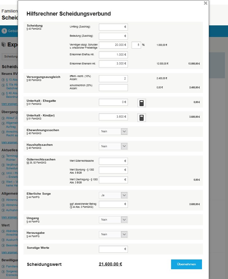 Fehlerhafte Honorarabrechnungen sind äußerst peinlich. Wenn Sie mit AnwaltsGebühren.Online abrechnen, vermeiden Sie derlei Berechnungsfehler: Dafür haben Sie zum Beispiel bei einem komplexen Sachverhalt wie dem Scheidungsverbund nützliche Hilfsrechner an Bord. Eine eingebaute Plausibilitätsprüfung steht Ihnen ebenfalls als Sicherheitsnetz zur Seite. Die eingeblendeten Tipps des Expertenwissens tun ihr Übriges, damit Sie bei Ihrer aktuellen Honorarberechnung nichts übersehen. Maximale Sicherheit für Sie!
