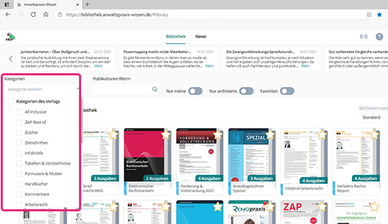 Möchten Sie sich nur Titel einer bestimmten Kategorie anschauen – z. B. Literatur aus dem Arbeitsrecht –, klicken Sie auf die Schaltfläche „Kategorie wählen“. Es klappt ein Menü aus, in dem Sie bestimmte Kategorien per Mausklick auswählen können. Anschließend werden Ihnen nur jene Bücher und Fachzeitschriften angezeigt, die der gewählten Kategorie angehören.