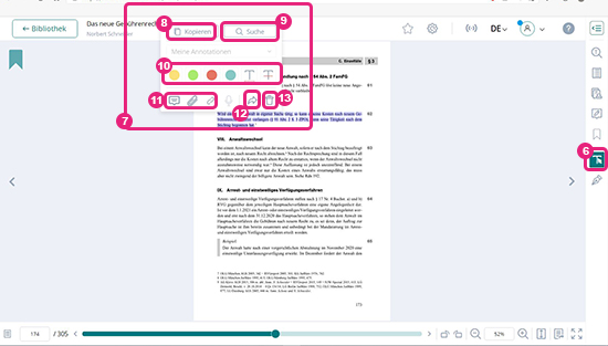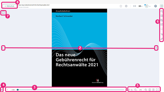 Wenn Sie das Lesen in einem Werk beenden möchten, klicken Sie oben links auf „< zurück zur Bibliothek“ (8). Sie landen dann wieder in Ihrer Bibliotheksübersicht.