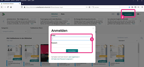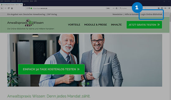 Über die Internetseite von Anwaltspraxis Wissen. Klicken Sie dort oben rechts auf „Mein Anwaltspraxis Wissen“ (1).