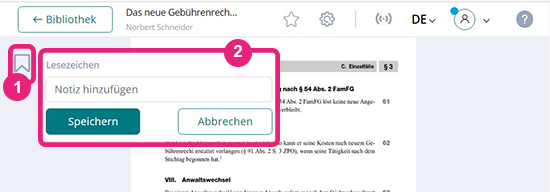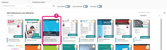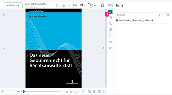 Der schnellste Weg, um in einem Werk zu lesen: Klicken Sie einfach das Titelbild des gewünschten Buches oder der gewünschten Fachzeitschrift in Ihrer Bibliotheksübersicht (1) an. Sie landen direkt im ausgewählten Werk. Für dieses Tutorial öffnen wir das Buch „Das neue Gebührenrecht für Rechtsanwälte 2021“.