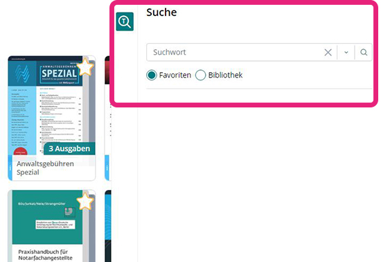 Mit Klick auf die Lupe am rechten Bildschirmrand können Sie in Anwaltspraxis Wissen nach Inhalten zu einem beliebigen Stichwort oder zu einer beliebigen Kombination aus Stichworten suchen. Dabei haben Sie die Wahl, ob Sie nur die Werke, die Favoriten, ODER die gesamte Bibliothek durchsuchen.