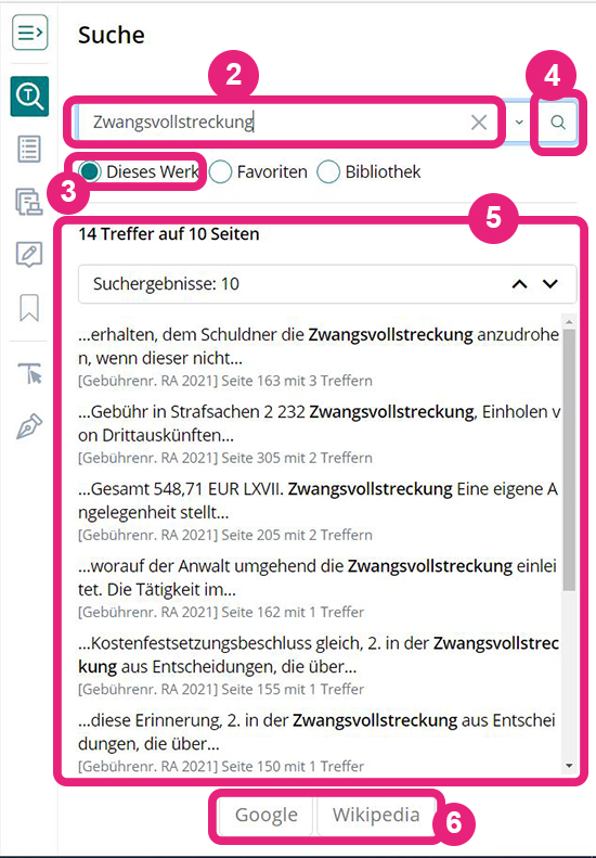 Nehmen wir an, dass Sie nach Fundstellen zum Begriff „Zwangsvollstreckung“ suchen möchten. Sie schreiben „Zwangsvollstreckung“ (ohne Anführungszeichen) in das Suchfeld (2).