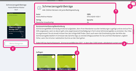 Wenn Sie wieder zur Übersichtsseite Ihrer Bibliothek zurückkehren möchten, klicken Sie einfach auf das kleine Kreuz oben rechts (5), um das Popup-Fenster mit der Kurzinformation zu schließen.