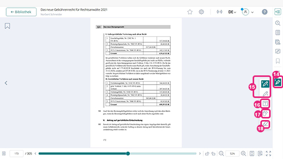 Um auf die Arbeitswerkzeuge von Anwaltspraxis Wissen zuzugreifen, müssen Sie sich in einem geöffneten Werk befinden. Als Beispiel wählen wir das Buch „Das neue Gebührenrecht für Rechtsanwälte 2021“. In der Detailansicht des Buches beschäftigen wir uns nun mit den unteren drei Icons der rechten Leiste.