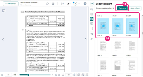 Nun können Sie die zu druckenden Seiten per Mausklick auswählen. Um Ihnen die Auswahl zu erleichtern, werden in der Druckansicht rechts die Seiten aus der direkten Umgebung zu der von Ihnen in der Leseansicht geöffneten Seite angezeigt. Dass Ihre Auswahl übernommen wurde, erkennen Sie an den eingekreisten Haken, die anschließend auf den entsprechenden Seiten erscheinen (10). In einem einzelnen Druckauftrag können max. 10 Seiten am Stück gedruckt werden.