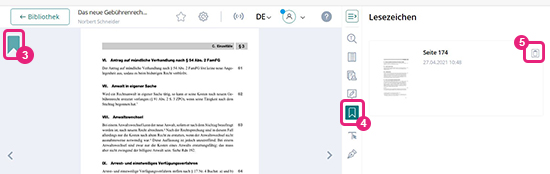 In der Lesezeichen-Markierung oben links (3) sehen Sie zudem einen kleinen Stift und eine kleine Mülltonne, wenn Sie mit der Maus hinübergehen. Sie können von hier aus also dem Lesezeichen nachträglich noch eine Notiz hinzufügen oder es wieder löschen. Möchten Sie all Ihre Lesezeichen sehen, klicken Sie auf das Lesezeichen-Icon in der rechten Leiste (4). Hier können Sie Ihr Lesezeichen auch wieder löschen (5).