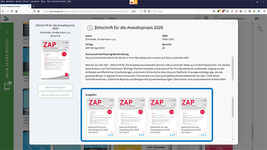 Bei den Fachzeitschriften können Sie über die Kurzinformation zusätzlich wählen, welche Ausgabe Sie sich anzeigen lassen möchten. Klicken Sie dazu einfach auf das Bild der jeweiligen Ausgabe. Zudem ist die Kurzinformation der Ort, an dem Sie eine einzelne Ausgabe oder einen gesamten Jahrgang einer Zeitschrift auf Ihren virtuellen Schreibtisch legen können.