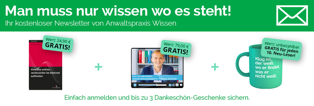 Bleiben Sie auf dem Laufenden mit dem kostenlosen Newsletter von Anwaltspraxis Wissen: Alle 14 Tage kommt eine kurzweilige Mischung an relevanten Fachbeiträgen, launigen Editorials und aktuellen Meldungen in Ihr E-Mail-Postfach: Alles, was Sie wissen müssen für Ihre Anwaltspraxis.